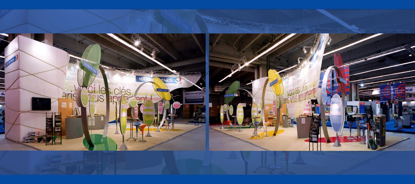 > Stand de 80 m² alliant des habillages (capitonnage), des présentoirs, de la signalétique. Modélisation 3D pour l'ensemble.